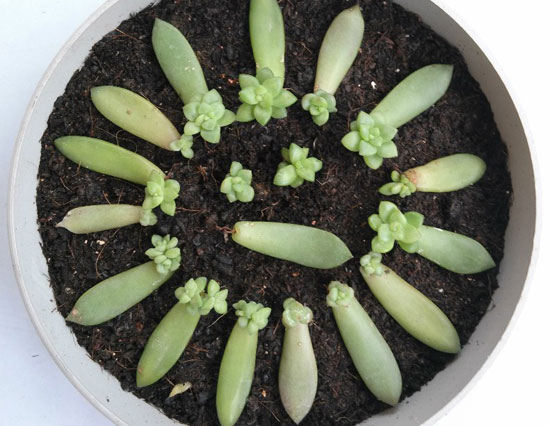 叶插: 常利用肥厚的叶片摆放在稍湿润的沙床或疏松的土面上,很快就会生根,在叶片的基部长出不定芽,形成小植株,如天章、石莲花、大叶落地生根等。